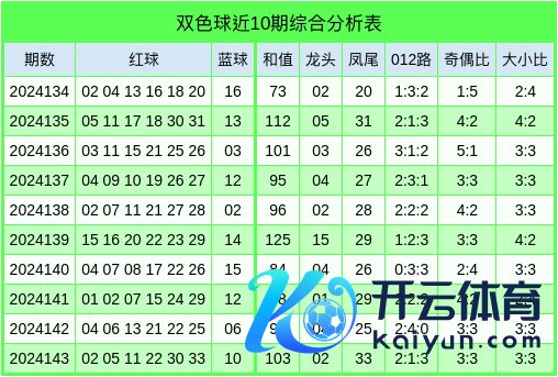 双色球2024143期开出奖号:红球02、05、11、22、30、33,蓝球10。 当期红球号码大小比为3:3,012路比为2:1:3,奇偶比为3:3。龙头开出02,凤尾开出33,和值为103。 豪杰近10期双色球红球轮廓分析 和值分析:上期和值为103,与上期比拟飞腾12个点位,本期瞻望和值在141隔邻开出。 奇偶分析:上期红球奖号的奇偶比为3:3,其中奇数较热。在最近10期开奖中,红球奇偶个数比为32:28。本期需要饶恕奇偶同比例出号,奇偶比饶恕3:3。 大小分析:上期红球奖号的大小比为3