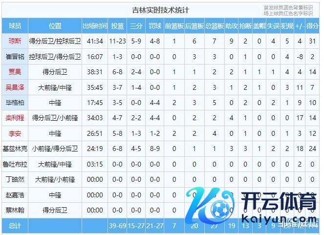 数据如下:琼斯31分7篮板9助攻2抢断、贾昊14分2篮板2助攻、吴昌泽7分3篮板2抢断、毕格柏10分5篮板2抢断、栾利程14分4助攻、李安12分4篮板、基兹林克24分3助攻3抢断;弗格27分9篮板2助攻、威尔斯15分5篮板5助攻、李晓旭5分5篮板、韩德君15分9篮板3助攻、张镇麟2分、王岚嵚8分6助攻、付豪8分4篮板、鄢手骐11分2篮板3抢断、图雷8分4篮板
